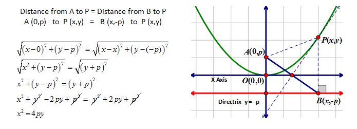 CONCEPT 3 – The Equation of a Parabola To arrive at the equation for the parabola we use its definition. To set this up we generate coordinates that represent these relationships. For simplicity we will use the origin (0,0) as the vertex. This creates a focal point that is directly above it, A(0,p) and a directrix that is the same distance from the vertex but in the opposite direction, y = -p. Traditionally the distance to the focal point from the vertex is labelled as p.