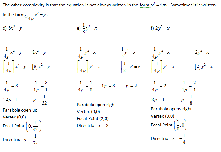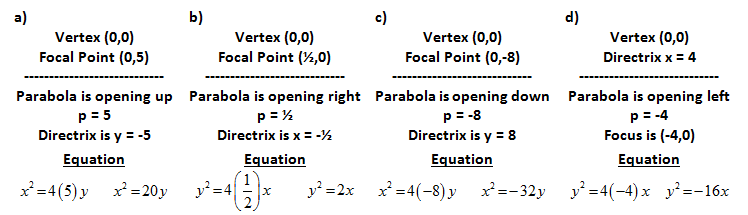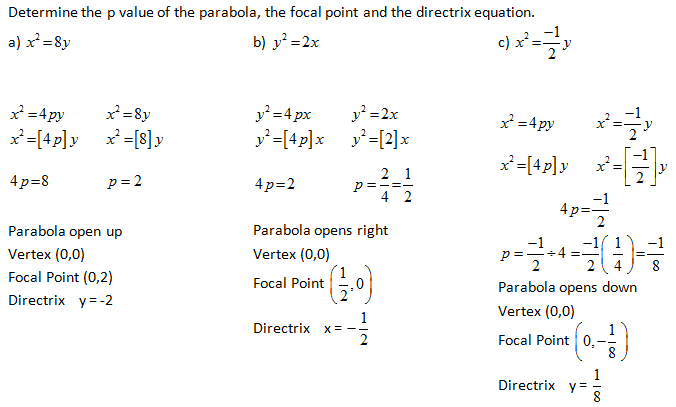 Understanding the forms of the equation and how the focal point, vertex and directrix relate to each other allows us to determine information from each other. The following examples display this connectivity.